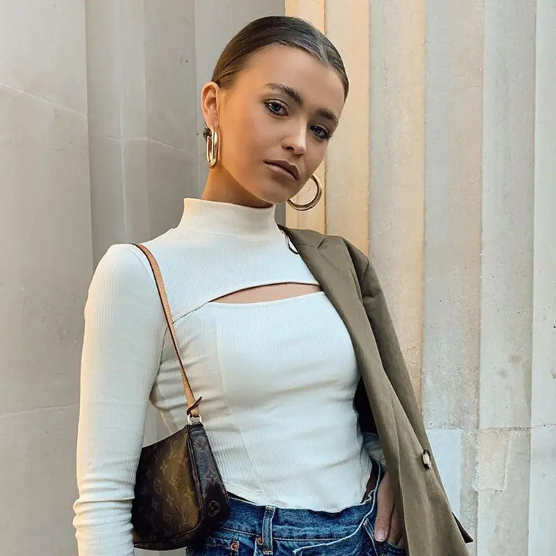 Göz alıcı oyuk tasarımı ve düzensiz kesimi ile bu tişört, kat kat giymek veya tek başına giymek için mükemmeldir ve dikkat çeken seksi bir görünüm sunar. Yüksek yakası, sofistike bir dokunuş katarak hem gündelik geziler hem de daha resmi ortamlar için ideal bir seçimdir.