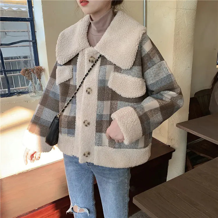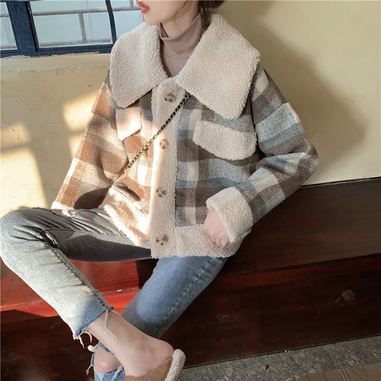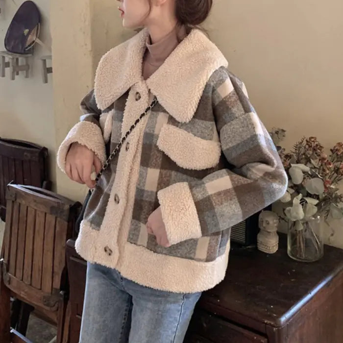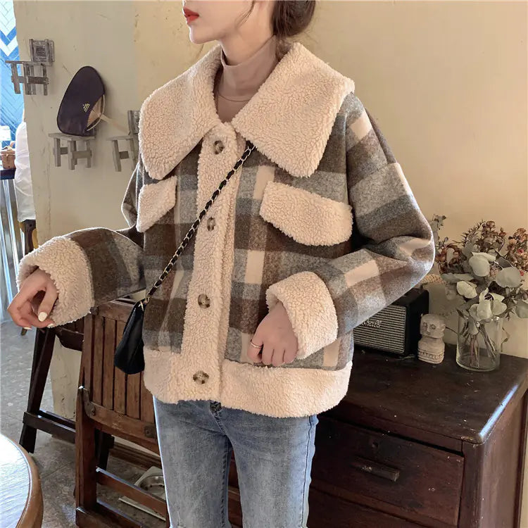 Kadınlar için Kore tarzı bol kesim kuzu yünü kareli ceket